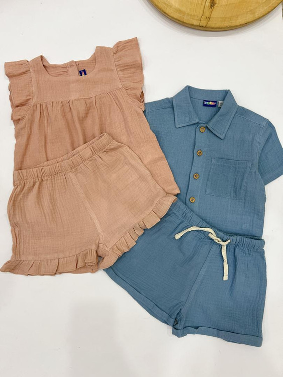 خاص بچه خوشتیپا. جنس : نخ موسلین لطیف مناسب ۸ سال. سایزبندی دخترانه: ۴ سال - قدبلوز ۳۸ عرض ۳۶ شلوارک ۲۴، ۴ تا ۶ سال - قدبلوز ۴۲ عرض ۳۸ شلوارک ۲۶، ۶ تا ۸ سال - قدبلوز ۴۵ عرض ۴۰ شلوارک ۲۸. سایزبندی پسرانه: ۴ سال - قدبلوز ۴۲ عرض ۳۵ شلوارک ۲۴، ۴ تا ۶ سال - قدبلوز ۴۴ عرض ۳۷ شلوارک ۲۷، ۶ تا ۸ سال - قدبلوز ۴۷ عرض ۳۹ شلوارک ۲۹.